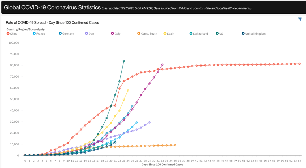 Here’s a new Covid-19 dashboard brought to you by IBM and the Weather Channel (I added to the Resources page, too). It’s easy to navigate and has good historical and trend analysis. If you want to test your Covid-19 knowledge, see if you can tell which line represents which country without looking at the chart legend.