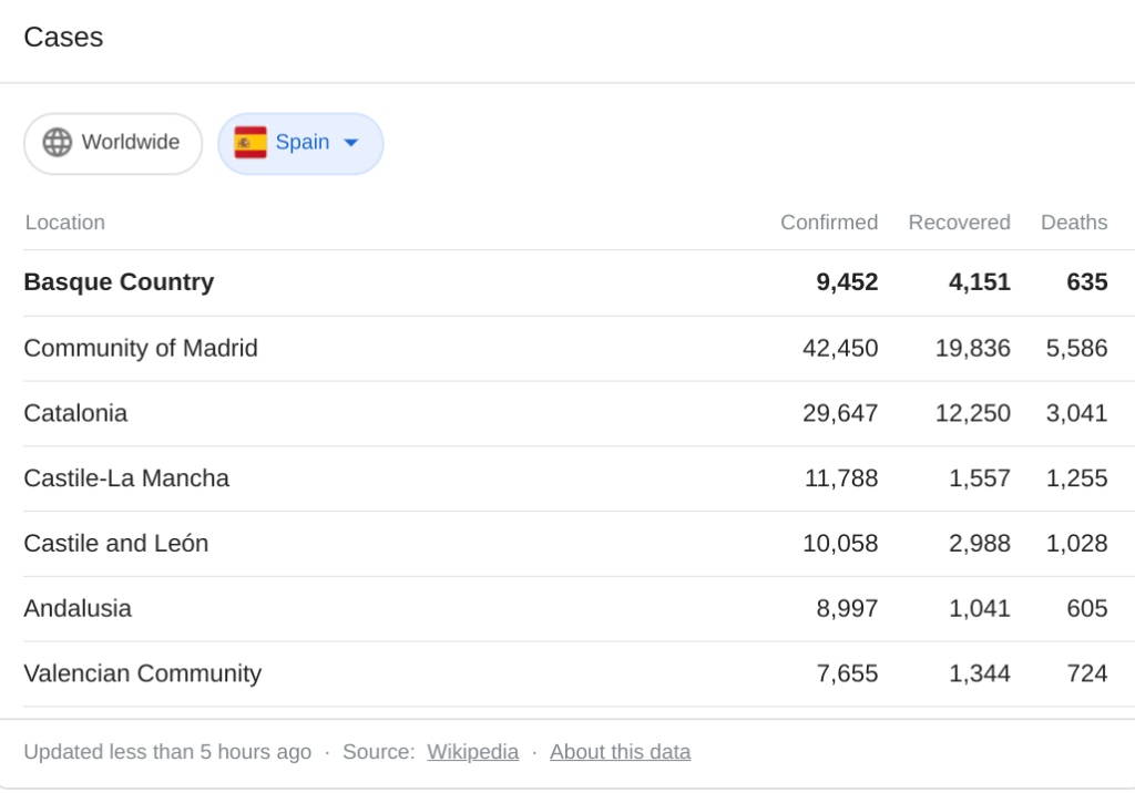 Other countries that have universal BCG vaccination include Japan, Brazil, Iran, and Portugal. Wait, Portugal?!? BCG vaccine may explain why Portugal has about 200 Covid-19 deaths while neighboring Spain has over 14,000. But wait! It turns out the Basque Country in Spain had a BCG vaccine program until 2013, too. It’s the only region in Spain that has a recent BCG program. So, are Covid-19 mortality numbers better in Basque Country than the rest of Spain?