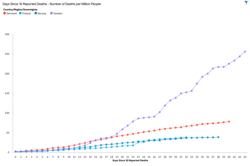 The anti-lockdown contingent is promoting Sweden’s lockdown-lite as a huge success at saving its economy while providing adequate safety. First, we don’t really know how Sweden’s economy is doing compared to its Scandinavian neighbors or Europe. Second, compared to neighboring countries with strict lockdowns, I have to say, looking at the chart above, that Sweden’s lockdown-lite is kind of a disaster. While Norway, Denmark, and Finland have flattened their Covid-19 mortality with strict lockdowns, Finland clearly has not got its infection rate R below one yet. So, if 5x – 6x higher mortality is acceptable for maybe saving a country’s economy (we don’t know yet), well, Sweden is your prime example.