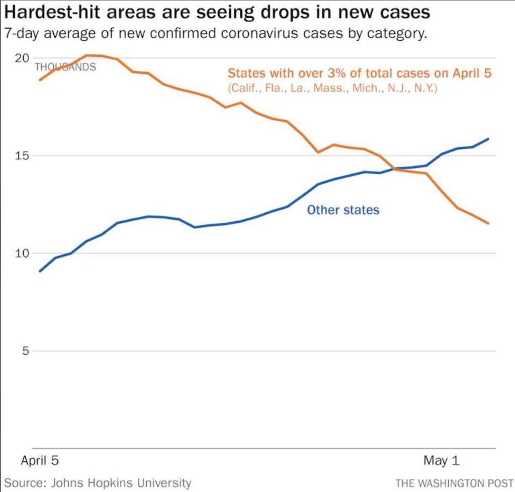 The US has two Covid-19 trends. States that had the most Covid-19 cases in early April are seeing their caseload decline as a result of social distancing. The rest of the states are seeing their Covid-19 caseload increase.