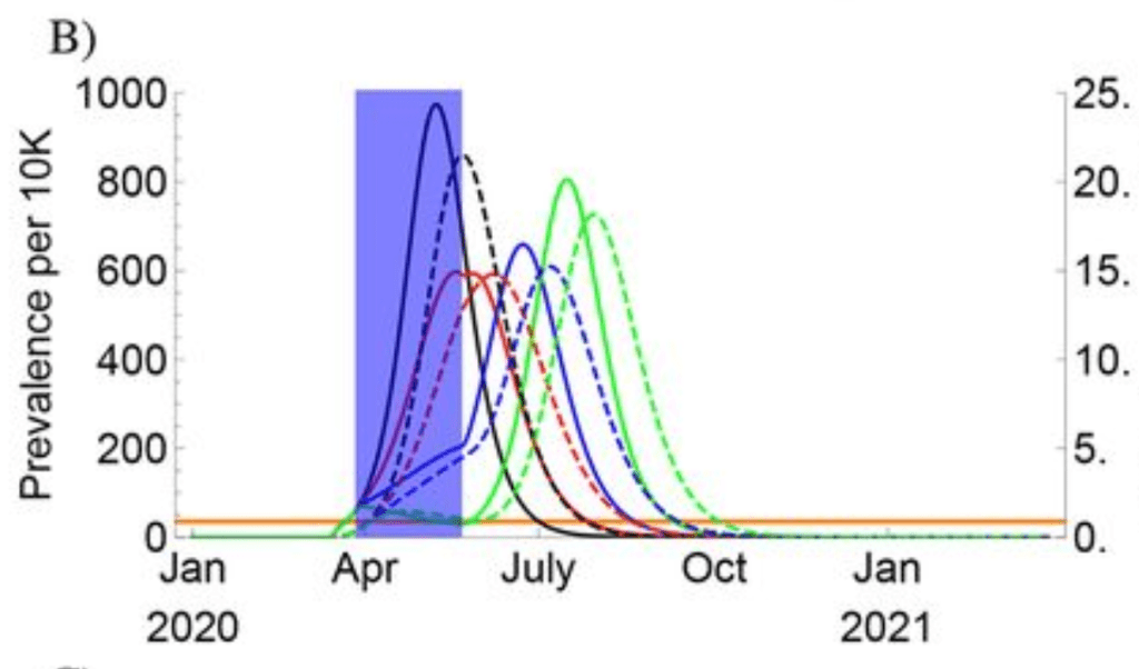 Of course, it’s difficult to predict what will happen as a result of changing Covid-19 restrictions. How difficult? Here’s a Harvard paper that discusses a Covid-19 outbreak model and below is a small part of what the model predicts. This chart shows Covid-19 infection for a population that does eight weeks of social distancing without corrections for possible seasonality.