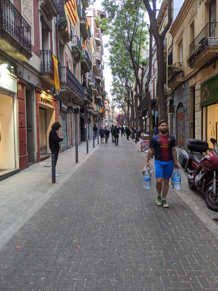 It’s clear that not everyone wears a mask. On Carrer del Verdi, which was Gracia’s version of Restaurant Row in Manhattan all those days ago when restaurants were allowed to operate, I counted about half the people with and half without masks. On the quieter side streets, most people weren’t wearing masks.