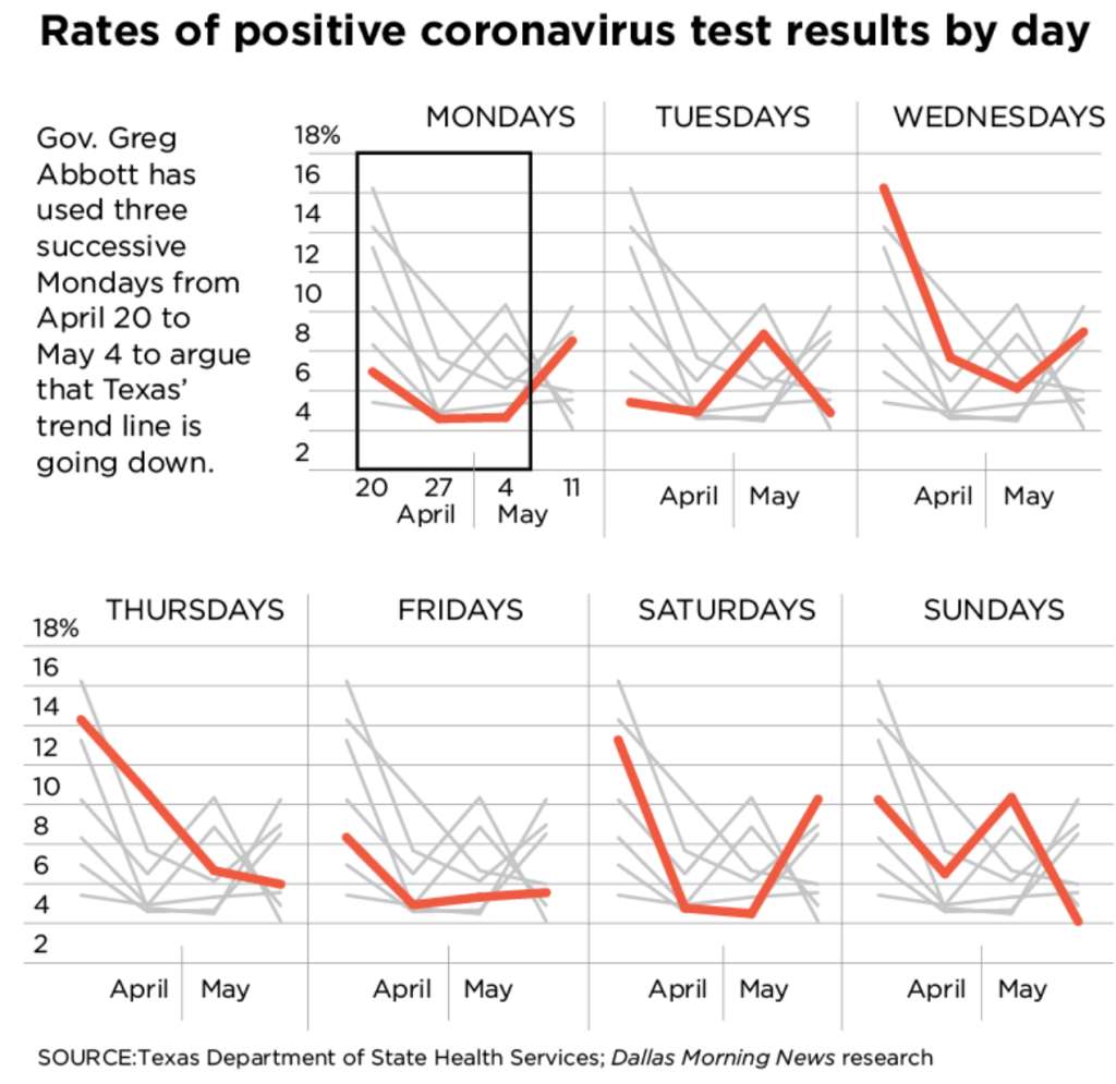 By looking at positive test results only on Mondays and conveniently ignoring the most recent Monday test result, Gov. Abbot argued that Texas had met federal guidelines to relax Covid-19 restrictions. When you’re governor, you get to choose the data you like to tell your Covid-19 compliance story, even if it has nothing to do with good public health science.