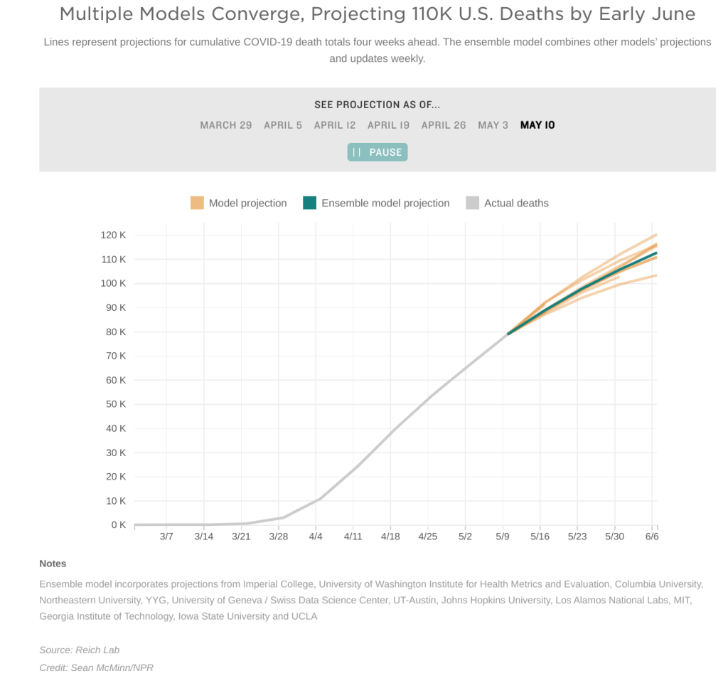 The US Covid-19 mortality models are converging to 110k deaths by the first week of June. Each of the underlying models in the “ensemble” of models is adjusted as newer and better data appear. Researchers retrain machine learning models and make other adjustments. With so much still unknown about Covid-19 and the swings in each model’s prediction, the UMass ensemble model “averages” the models’ underlying assumptions to yield a better prediction.