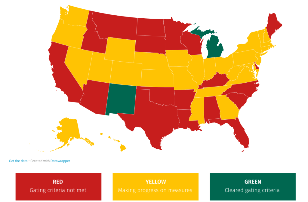 In the US, none of that is keeping states from reopening before they’re ready. According to Covid Exit Strategy, two states are ready.