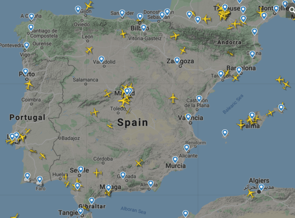 A couple months ago, I posted a flight tracker image that showed three commercial flights over all of Spain. I looked just now and there are about twenty.