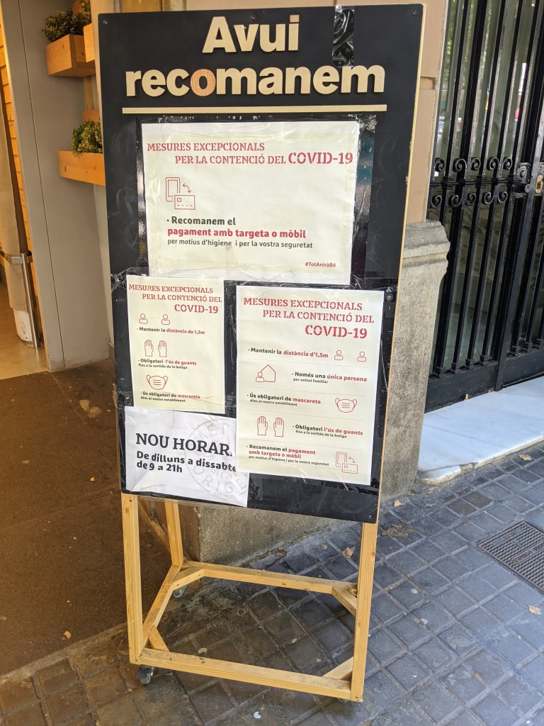 All the grocery stores have about the same shopping protocol. As with most signage in a cosmopolitan city, the graphics make the instructions clear even if you don’t know Catalan or Spanish. The number of customers inside the store is limited and customers must wear masks (your own) and gloves (provided). Sometimes hand sanitizer is available. Paying by mobile is recommended, although a credit card seems just as safe if you tap it instead of having staff insert it. My biggest complaint is that I usually can’t unlock my mobile with my fingerprint when I’m wearing gloves so I have to type in my code. Boo-hoo.