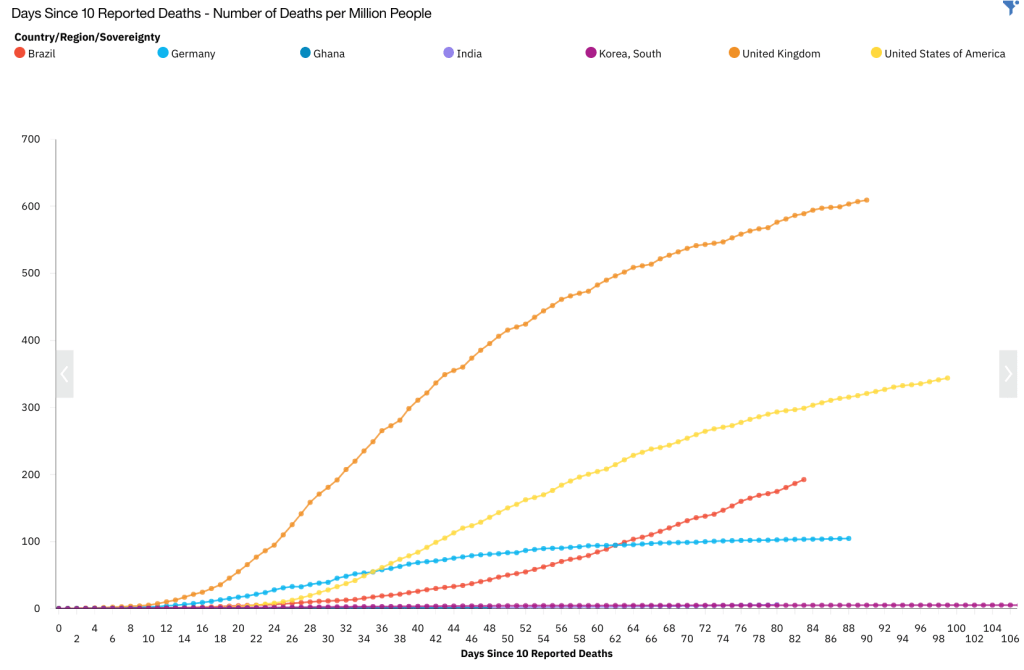 Here’s a chart with three countries that have made contact tracing work (South Korea, Vietnam, Ghana), one country which locked down early and put in place effective testing after it was too late for contact tracing (Germany), and four countries with conservative governments that were late to lockdown and poor on testing (US, UK, Brazil, India).