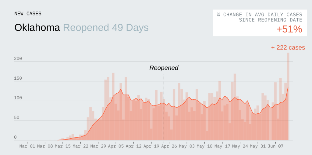 The CDC finally released Covid-19 guidelines, what, like two months late? Meantime, many states that pushed to re-open are experiencing spikes in Covid-19 cases and hospitalizations. Here’s yet another handy report that shows change in Covid-19 cases after each US state re-opened. For instance here’s Covid-19 cases in Oklahoma, where, in deference to Juneteenth, Trump has postponed next week’s election campaign kickoff rally in Tulsa by a day.