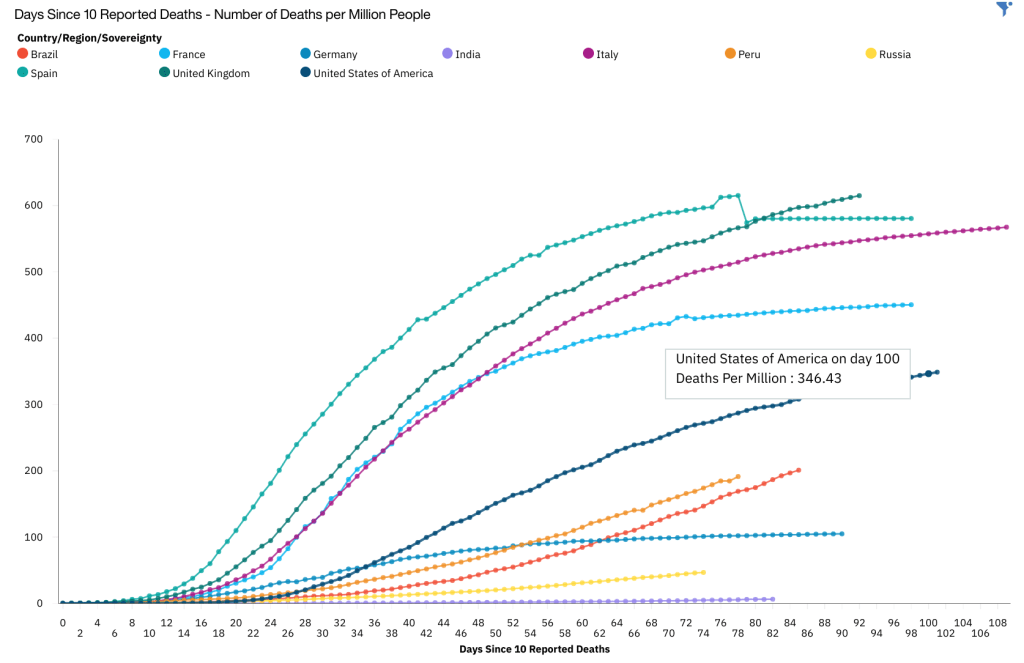 What I failed to predict in March was that the US curve would continue rising after it reached Spain’s and Italy’s end-of-March mortality rates. Given the extra weeks the US had to prepare its Covid-19 response and the CDC’s pandemic expertise, my assumption was that the US Covid-19 mortality curve would flatten sooner than Spain’s and Italy’s morality curves flattened, that the US curve would flatten at about the same per capita mortality Spain and Italy reached a month into their Covid-19 outbreaks.