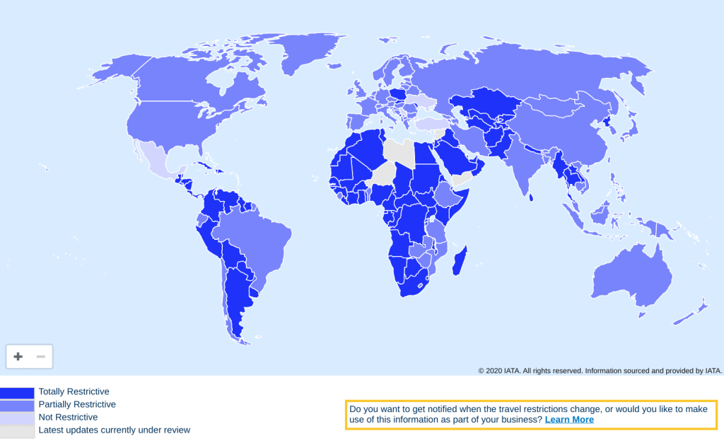 Click on any country on the IATA interactive world map to find travel restrictions for your desired destination. That will tell you what restrictions apply at the time you click, although not in a week or two when you might want to travel.