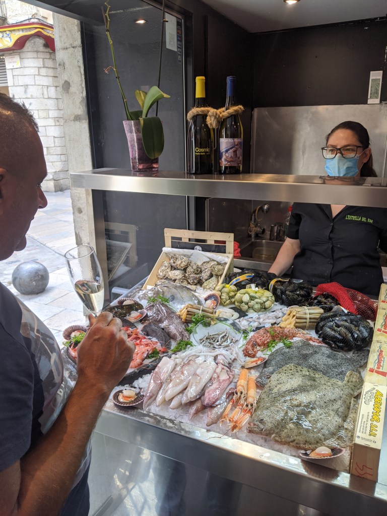 Then yesterday I found myself in Girona. With fresh memories of Girona after our trip a couple weeks ago, Brad and I played tour guide for our Catalan friends Joanmi and Francesc. This trip was by car instead of train and took about the same time door-to-door. We viewed the Barceloninan landscape artist Modest Urgell and other Catalan artists at the Museu d’Art de Girona, and then descended to L’Estrella del Mar where Joanmi and Francesc selected almuerzo from the fresh catch.