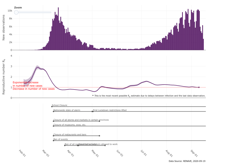 The Covid-19 effective reproduction rate Re (yellow bars above) went up the last two weeks of June, leveled off for a couple weeks, has been declining since mid-July, and has been less that 1.0 since the beginning of this month.