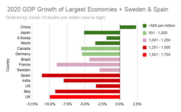Using a different data set from the NBER and FEE anti-lockdown arguments above, let’s look at recent world GDP data. Below is the estimated 2020 GDP growth for the world’s largest economies in order of Covid-19 deaths per million. For reasons explained below, I’ve added Sweden and Spain to the chart.