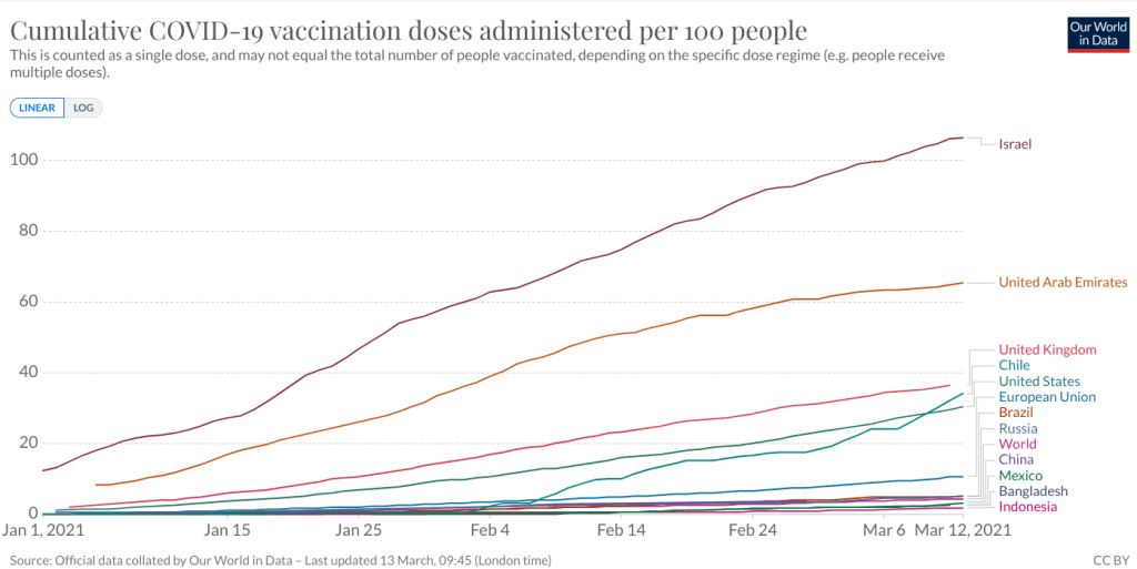 Cumulative Covid-19 vaccine doses administered by country as of 14 January 2021. Source: Our World in Data.