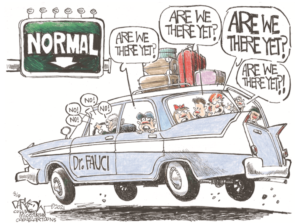 Driving towards normal as Covid-19 vaccines rollout. Source: John Darkow, Cagle.