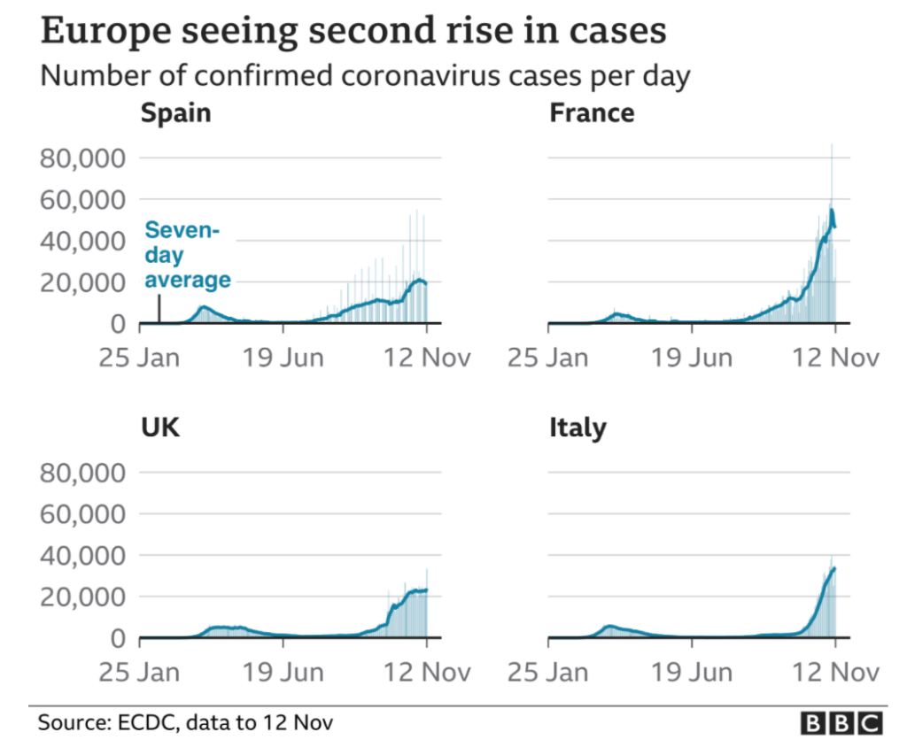 Like Spain, the European countries in the chart above—UK, Germany, and Italy—saw Covid-19 numbers increase in October and imposed Covid-19 restrictions around the beginning of November. The chart shows how Covid-19 infections in all three of those European countries peaked and now are dropping. While Trump has been in the White House or on the golf course sulking about his loss, the US has applied few new restrictions and Covid-19 cases are climbing inexorably (the recent bump down probably is a holiday reporting anomaly).